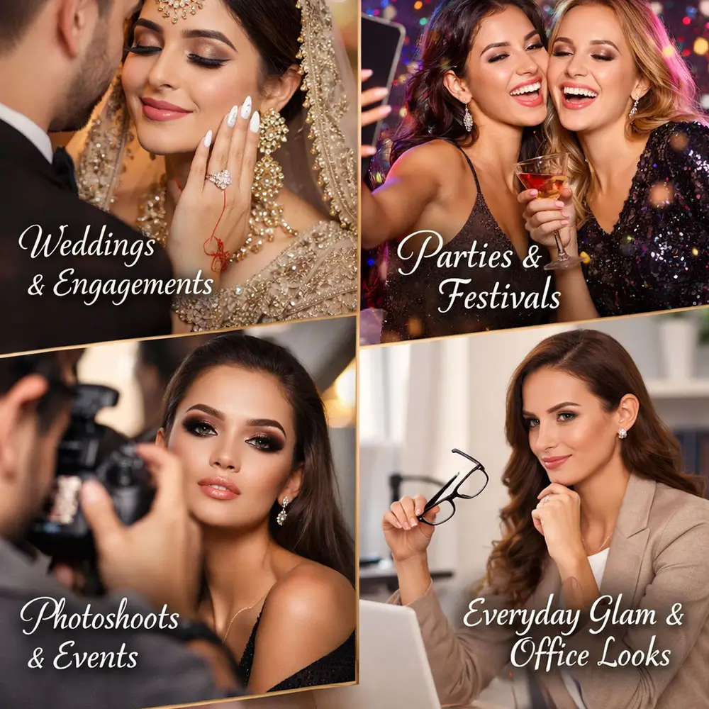 From elegant weddings and engagements to glamorous parties and festivals, Nailashes enhances every look. Be camera-ready for photoshoots and events or keep it subtle with everyday glam and office-ready styles, crafted to suit every moment beautifully. Our nail and lash services are perfect for: